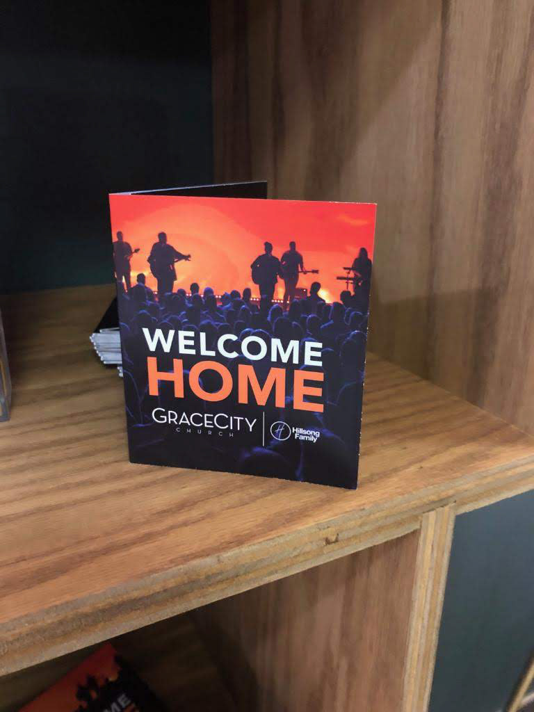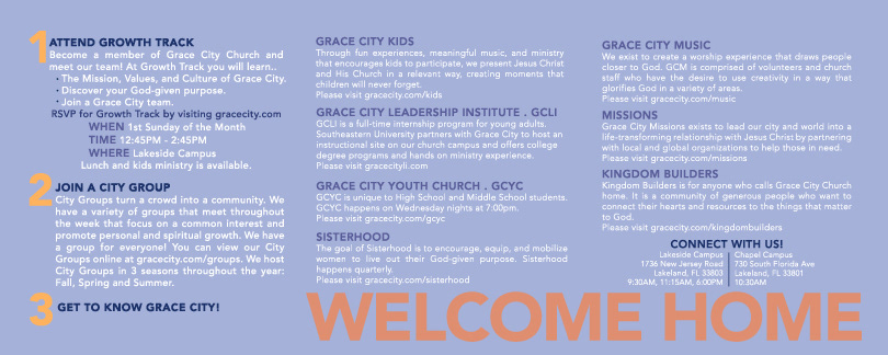 Proper information for new visitors at Grace City Church is provided in this pocket-sized tri-fold showing them a glimpse of what the Grace City Experience is like as well as educating them on next steps they can take to become an active member of the church community.
