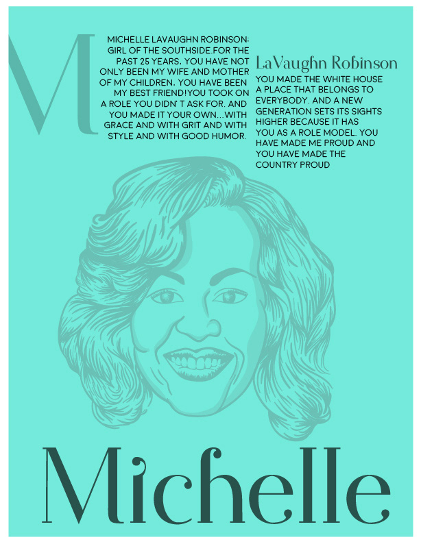 Illustration of Michelle Obama : Study of varied line weight to add texture with a greyscale illustration.